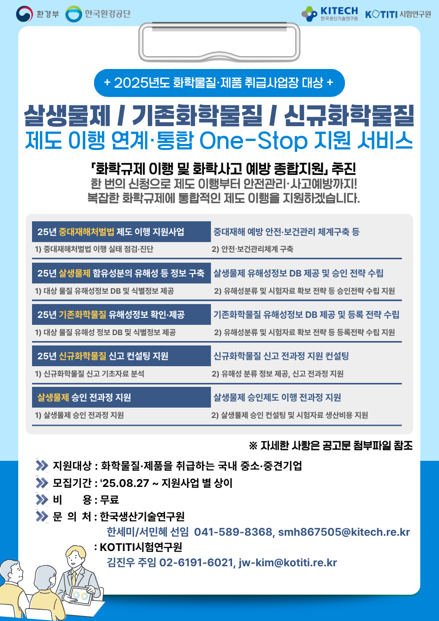 제목 | 2025년도 화학물질·제품 취급 사업장 대상 『화학규제 이행 및 화학사고 예방 종합지원』 추진 안내 | ||