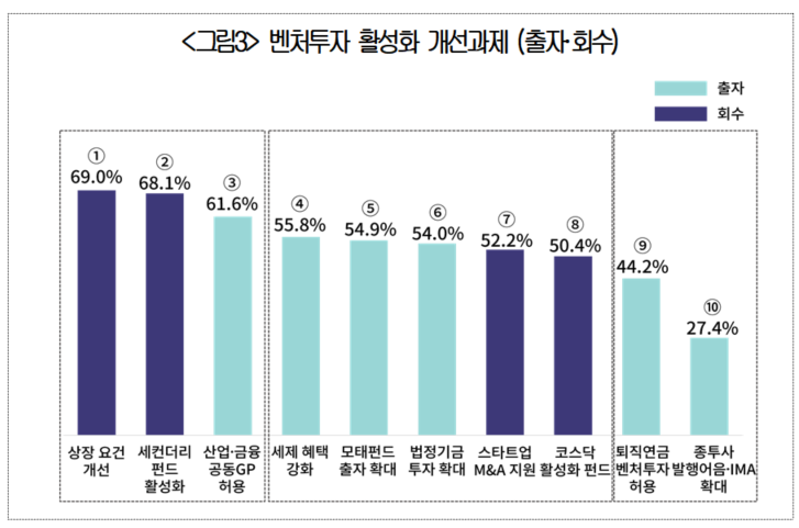 벤처투자 활성화 과제 : ‘기술특례상장 개선(69%)’, ‘산업-금융 공동GP 허용’(62%) 등 주로 꼽아