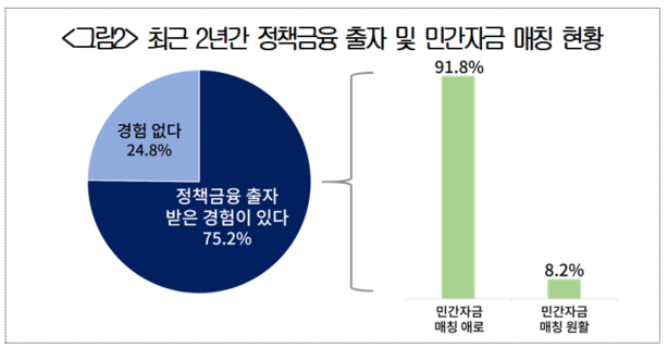 다만 정책금융 출자를 받은 회사의 대다수(91.8%)가 ‘민간자금 매칭에 어려움을 겪었다’고 응답해, 정책금융의 출자를 받는다 해도 민간부문에서의 자금조달 문제로 펀드결성이 쉽지 않은 것으로 나타났다. <‘어려움 겪지 않음’ 8.2%>
