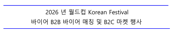 | 제목 | 2026년 월드컵 Korean Festival 바이어 매칭 및 B2C 마켓 행사 참가 기업 모집 안내 | ||