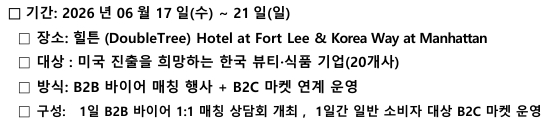 | ‒ | 2026년 월드컵 Korean Festival 바이어 매칭 및 B2C 마켓 행사 참가 기업 모집 안내 |