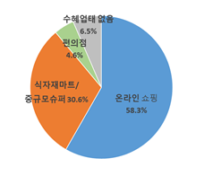 ‘대형마트 규제에 따른 수혜 업태 인식’에 관한 질문에 대해서는 절반이 넘는 58.3%의 응답자가‘온라인쇼핑’을 꼽았다. 다음으로는 식자재마트 ․ 중규모 슈퍼마켓(30.6%), 편의점(4.6%) 등이 뒤를 이었다. <수혜업태 없음(6.5%)>
