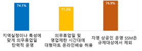 ②제도개선 사항 의무휴업일 탄력적 운영(74%), 의무휴업일 대형마트 온라인배송 허용(71%), 자영 소상공인 운영 SSM 규제대상 제외(77%)