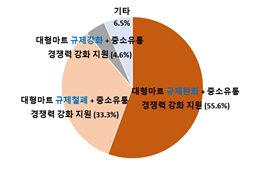 현재 유통산업발전법에 따라 대형마트, SSM*은 월 2회 공휴일에 휴업해야하며 자정부터 오전 10시까지 영업이 허용되지 않는다. * SSM(Super Supermarket): 기업형슈퍼마켓 이번 조사결과에 따르면 전문가 10명 중 7명(70.4%)은 대형마트에 대한 규제가 대형마트는 물론 보호대상인 전통시장까지도 패자로 내몰았다고 답했다.
